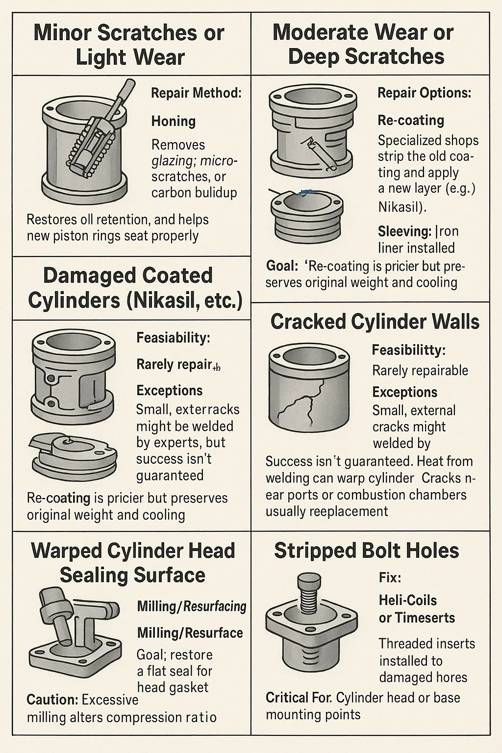 Yeniden kaplama: Uzman mağazalar eski kaplamayı soyar ve yeni bir katman uygular (örn. Nikasil).