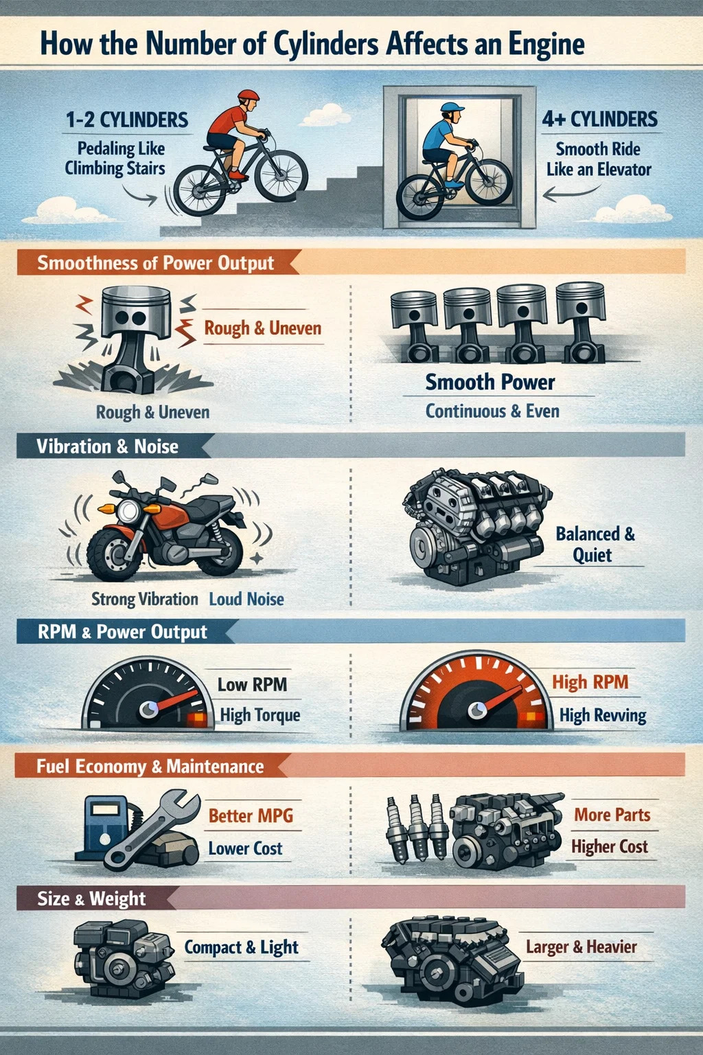 İyileştirme: Daha az silindirli motorlar, her yanmada daha büyük bir etkiye sahiptir ve titreşim daha doğrudandır (bu nedenle bazı büyük tek silindirli motorlar), silindir motosikletler uzun süre bisiklet sürdükten sonra ellerin uyuşmasına neden olabilir). Daha fazla silindirle her yanmanın kuvveti daha küçük olur, ses daha incelikli olur ve rölantide daha sessiz olur.