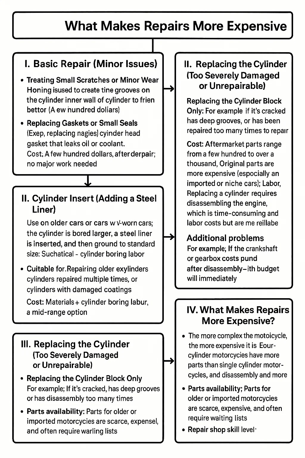 Bir onarımın maliyeti motosiklet silindiri öncelikle sorunun ciddiyetine, gerekli onarım türüne ve motosikletin yapısına bağlıdır. Aşağıda yaygın durumlara ilişkin açıklamalar bulunmaktadır: