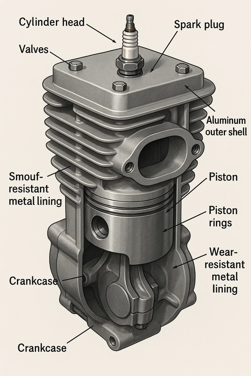 Genellikle pistonun aşınmasını önlemek için içinde aşınmaya dayanıklı metal astar (nikel-silikon kaplama veya demir astar gibi) bulunan alüminyum bir dış kabuk (hafif, hızlı ısı dağılımı) bulunur.