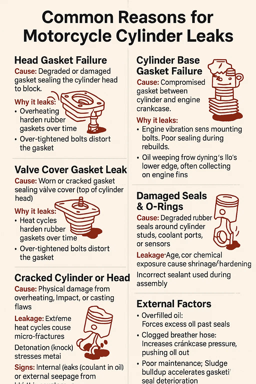 İşte bunun yaygın nedenleri motosiklet silindiri sızıntılar: